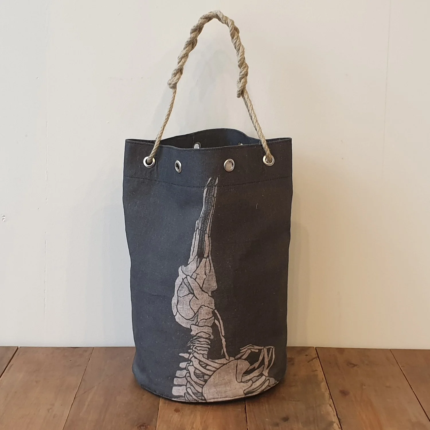 Handmade duffel bag with digital print of Franciscana dolphin skeleton on charcoal linen.